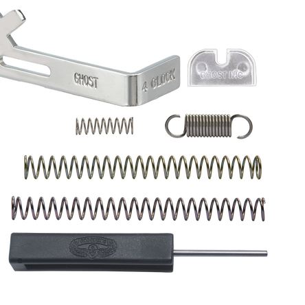 Przerywacz firmy Ghost PRO 3.3 lb/1.5 kg wraz ze sprężynami iglicy, spustu i blokady iglicy przeznaczony do pistoletów Glock generacji 1-5 (z wyłączeniem modeli 42 i 43 oraz 48) eliminujący zjawisko „bump”.
