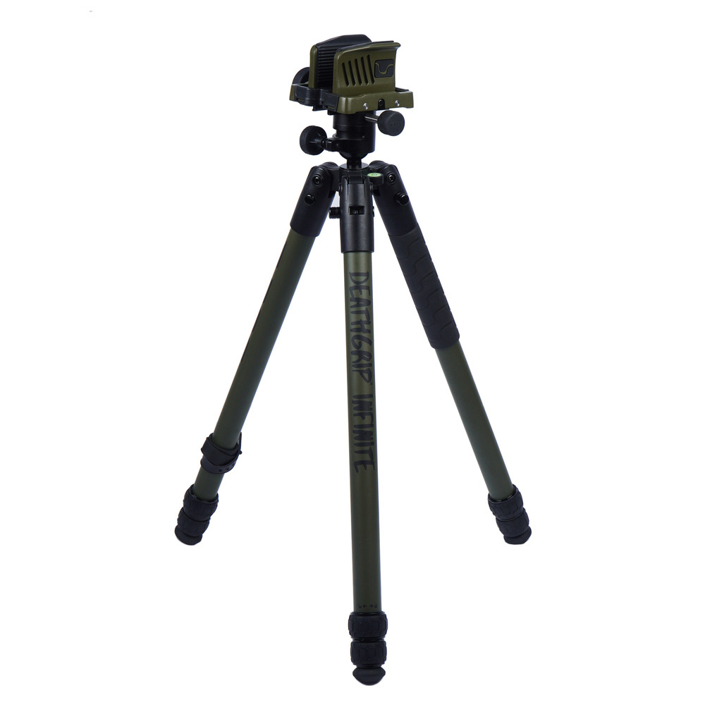 Lekki i regulowany trójnóg łożyskowy strzelecki Deathgrip® Infinite z montażem Arca Swiss Rail, który umożliwia szybką wymianę użytkowanego sprzętu. Sam uchwyt Deathgrip® pozwala na zamocowanie różnych rzeczy jak luneta obserwacyjna, broń lub nawet aparat fotograficzny. Uchwyt zaciskowy Deathgrip® posiada gumowaną powierzchnię, która zapobiega otarciu lub uszkodzeniu powierzchni przedmiotów. Posiada udźwig do 25 kilogramów.