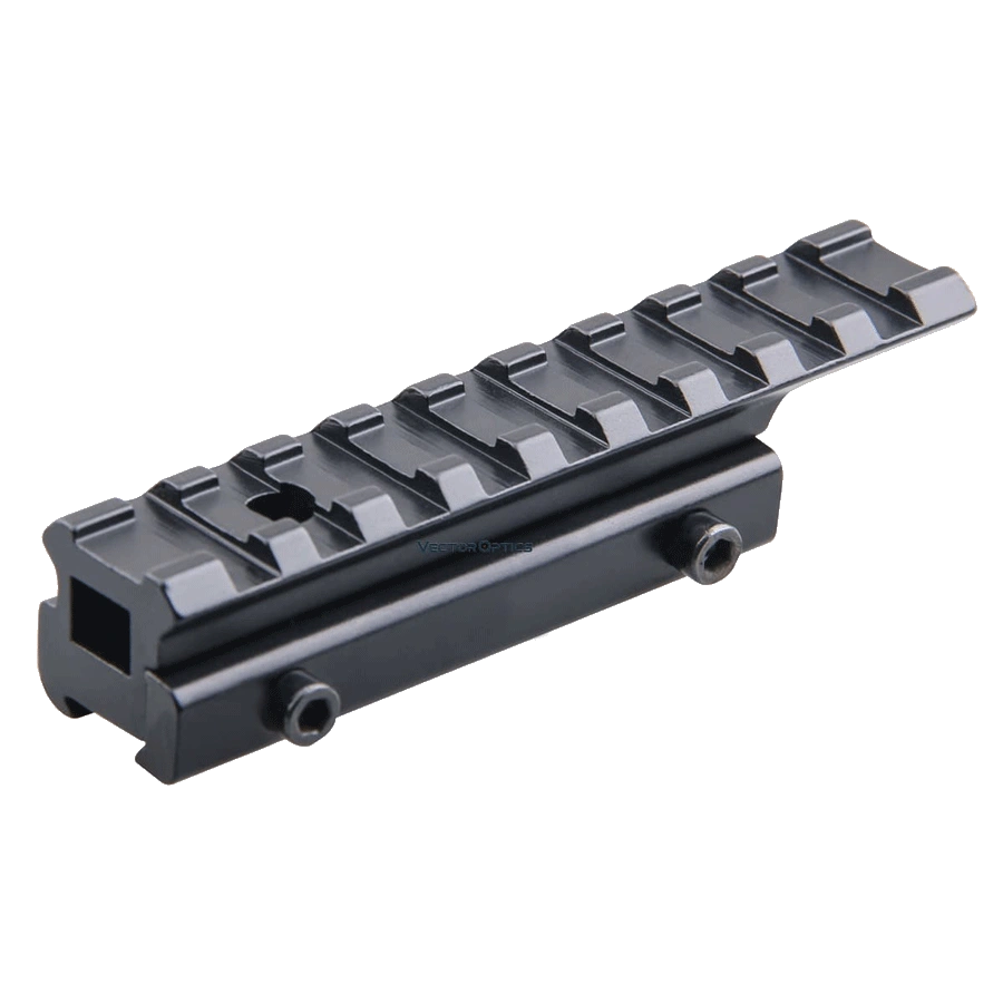Adapter na podwyższeniu z szyny Dovetail na Picatinny od firmy Vector Optics. Pozwala na podwyższenie linii celownia, a także zastosowanie wyposażenia kompatybilnego z szynami Picatinny, na przykład kolimatora do broni palnej. Adapter został wykonany z aluminium stopu 6061-T6 poddanego anodyzacji, tworzącej ochronną powłokę przed warunkami atmosferycznymi i uszkodzeniami mechanicznymi.