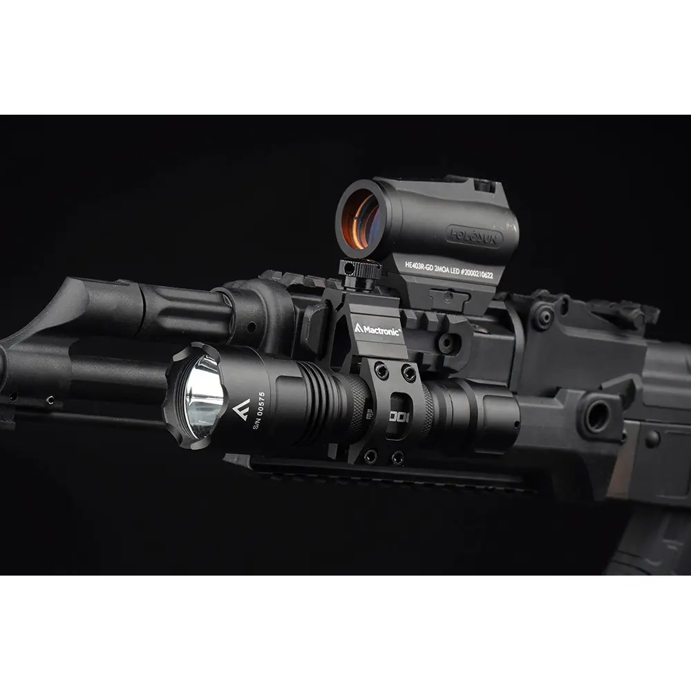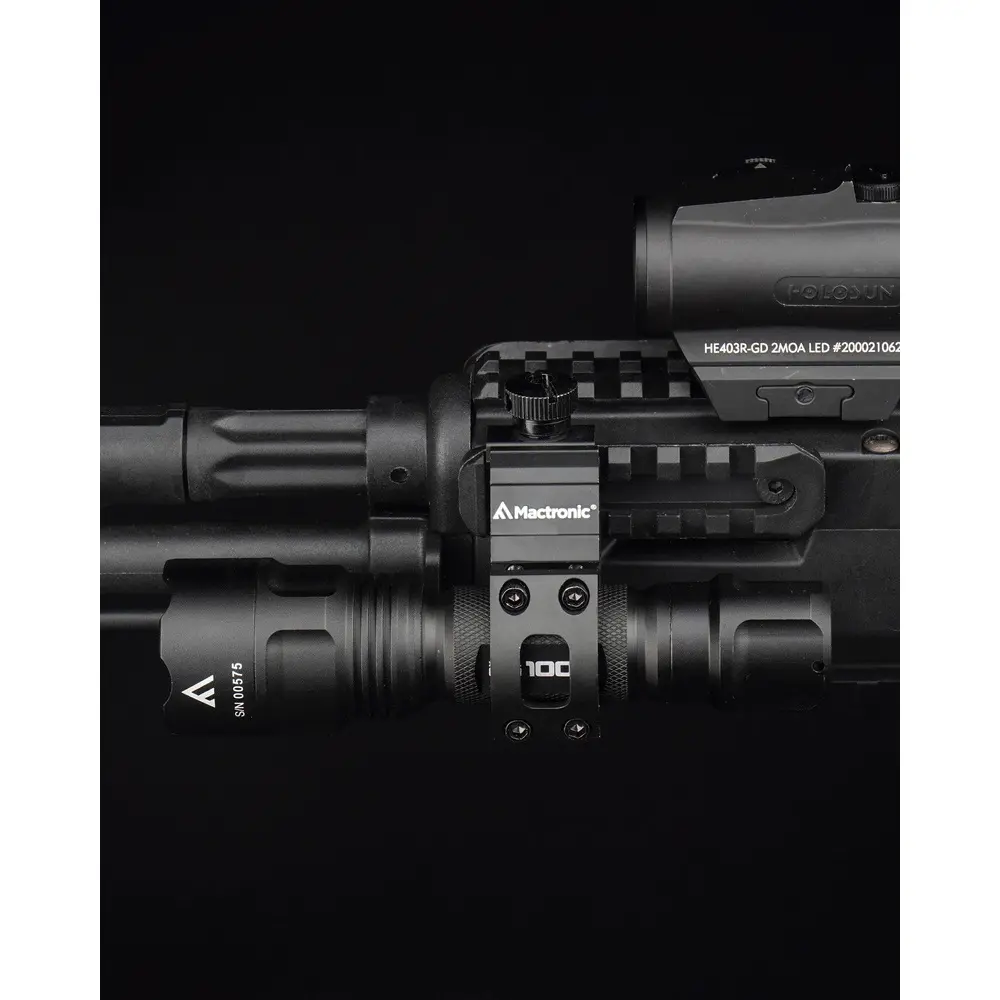 Uchwyt kompatybilny z systemem Picatinny umożliwiający zamontowanie na karabinie szerokiej gamy latarek ręcznych o średnicy uchwytu wynoszącej od 20 do 23 mm, takich, jak latarki taktyczne Mactronic Black Eye 1550 lm THH0047 i Black Eye 1000 lm THH0049.