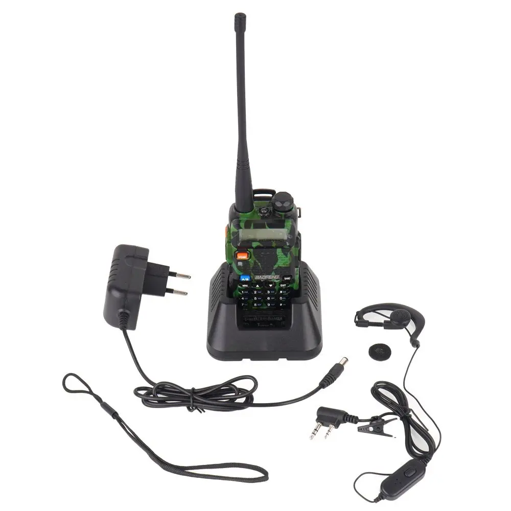 Radiotelefon VHF/UHF UV-5R HT Duobander PTT od firmy BaoFeng, o mocy 5 watów, , z podwójnym wyświetlaczem, 41 pozycyjnym menu, selektywnym wywoływaniem, funkcją Dual Watch, latarką LED, radiem FM i obudową pokrytą kamuflującym wzorem.