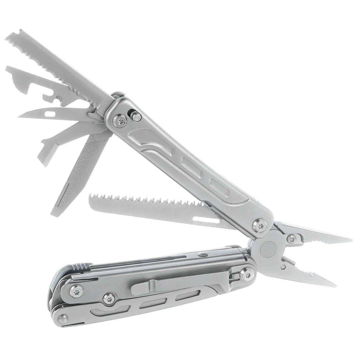 Rękojeść – wykonana została z satynowanej stali nierdzewnej AISI 440, co gwarantuje odporność na wilgoć, zarysowania i zużycie mechaniczne. Konstrukcja skeleton z frezowanymi otworami redukuje masę i zwiększa sztywność, zapewniając wygodę użytkowania nawet podczas długiej pracy. Ergonomiczne zaokrąglenia poprawiają komfort operowania narzędziami, a tekstura chwytu wspiera kontrolę nad narzędziem w każdych warunkach. Model wyposażono w klips typu deep carry do niskoprofilowego przenoszenia oraz otwór na linkę umożliwiający dodatkowe zabezpieczenie. Długość uchwytów została zoptymalizowana do pracy z piłą i kombinerkami, oferując stabilność i precyzję. To kompleksowe, solidne narzędzie dla wymagających użytkowników ceniących uniwersalność, trwałość i praktyczność w jednym kompaktowym multitoolu.
