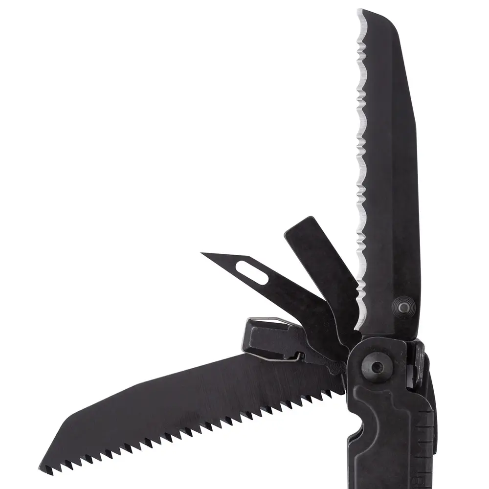 Multitool wyposażony został w aż 21 przydatnych narzędzi: kątomierz, śrubokręt philips, ostrze gładkie, zaciskacz przewodów, otwieracz do puszek i butelek, magnetyczne gniazdo na bity 1/4″, mały i duży śrubokręt płaski, ostrze do cięcia taśm/lin, śrubokręt do biżuterii, kombinerki, linijka, szpikulec, przecinak do drutu miękkiego, piła, ostrze ząbkowane, linijka w calach, złączka do przejściówek na bity 1/4″, dłuto, chwytak.