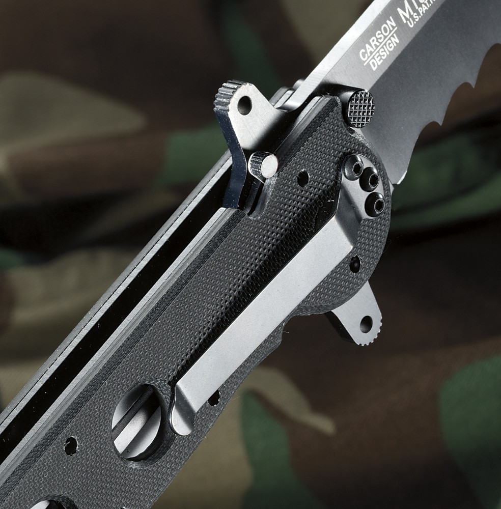 Noże z tej serii łączą w sobie unikalny design serii M16 Carsona oraz spełniają wymagania wojskowych specjalistów od wyposażenia. Zastosowano w nich ostrza typu Tanto z podwójnym szlifem ze względu na ich dużą wytrzymałość. “Otwarta” budowa pozwoliła na zastosowanie podwójnego flipera, dzięki czemu otrzymaliśmy podwójny jelec – rzadko spotykany w nożach składanych.