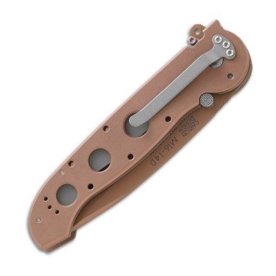 M16-14D posiada okładziny rękojeści z Aluminum, szeroką rękojeść umożliwiająca pewny chwyt zarówno w rękawiczkach jak i gołą dłonią, linery ze stali nierdzewnej 420J2, ostrze ze stali AUS 8, o współczynniku twardości 58-59HRC, z unikalnym ząbkowaniem Triple-Point Serrations.