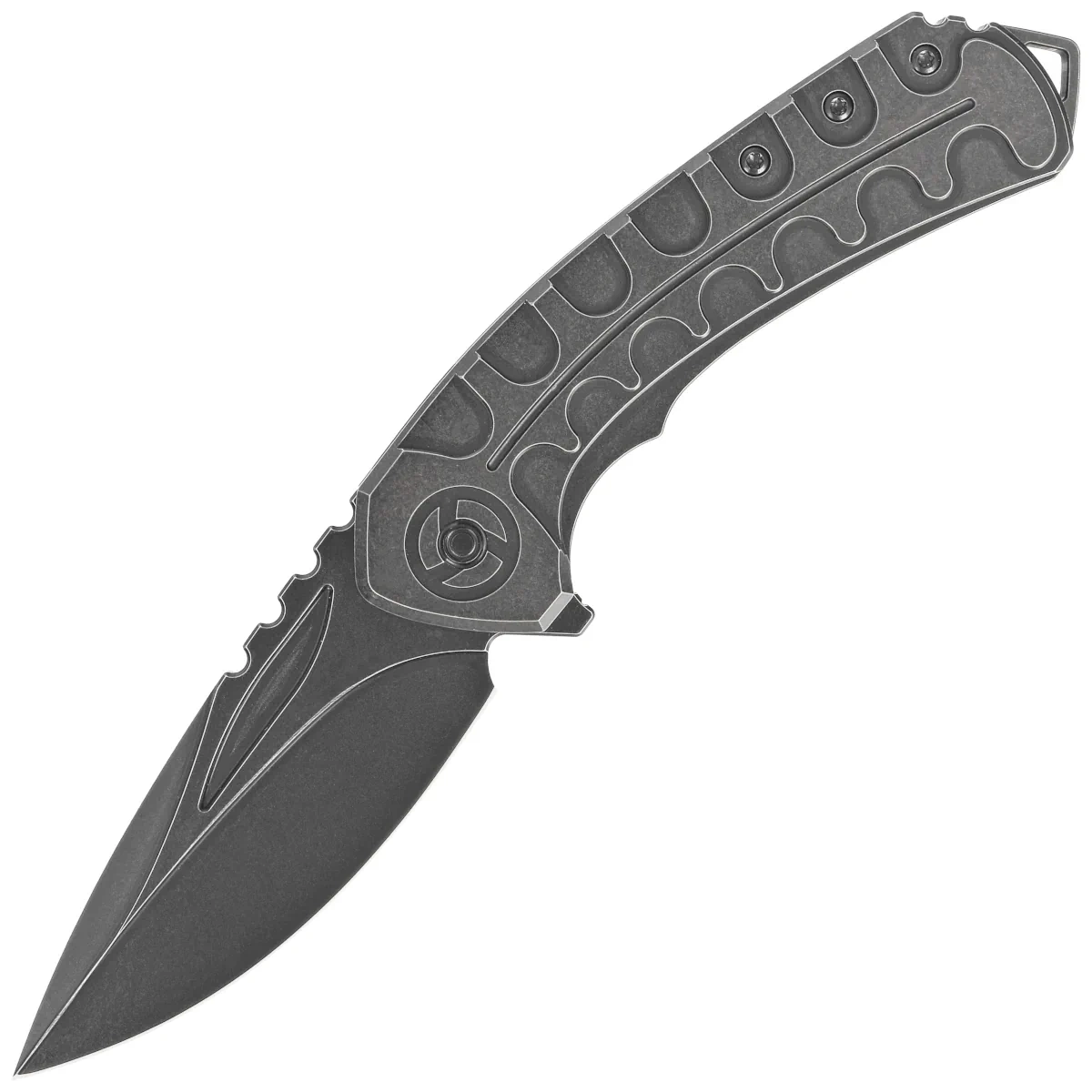 Rękojeść – to dwa kawałki litego tytanu 6AL4V. Fazowane krawędzie okładek eliminują ostre ranty dla wygody i poprawiają pewność uchwytu, dodatkowe zdobienie w kształcie łusek krokodyla. Masywny backspacer do którego przymocowano okładziny gwarantuje sztywność i wytrzymałość całej konstrukcji. Jednopozycyjny, prawostronny tytanowy klips umożliwia przenoszenie noża w pozycji tip-up, czubkiem ostrza ku górze. Wystająca część bacspacera tworzy otwór do przewleczenia linki asekuracyjnej lub ozdobnej, może również służyć jako zbijak do szyb.