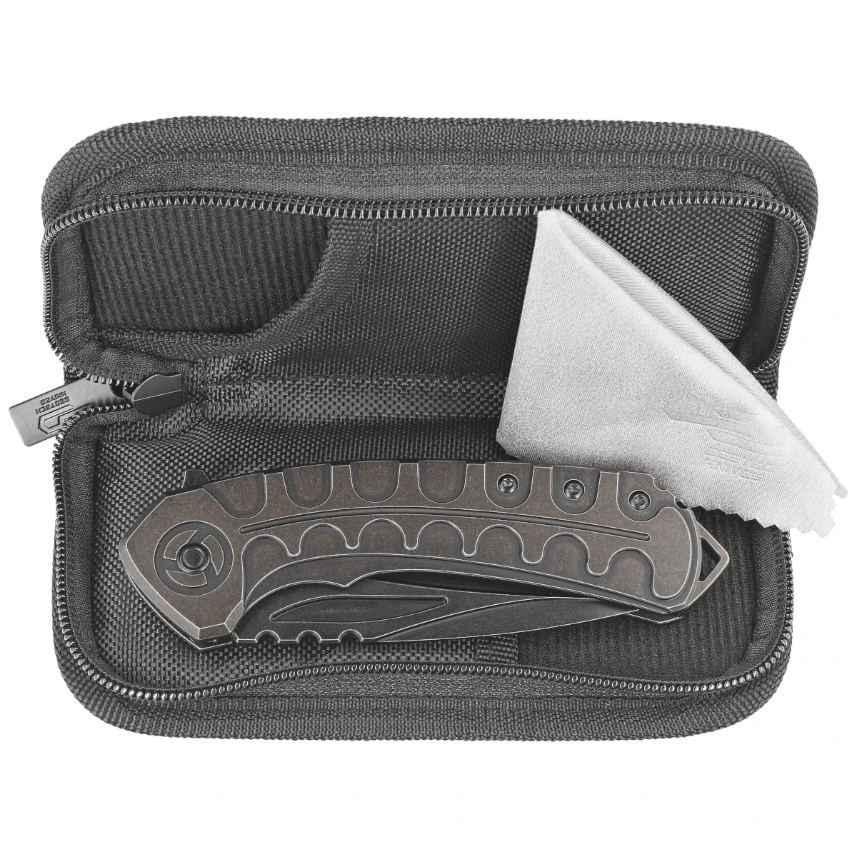 Futerał – nóż zapakowano w zapinany zamkiem nylonowy miękki pouch z logo marki służący do bezpiecznego przenoszenia i przechowywania foldera.