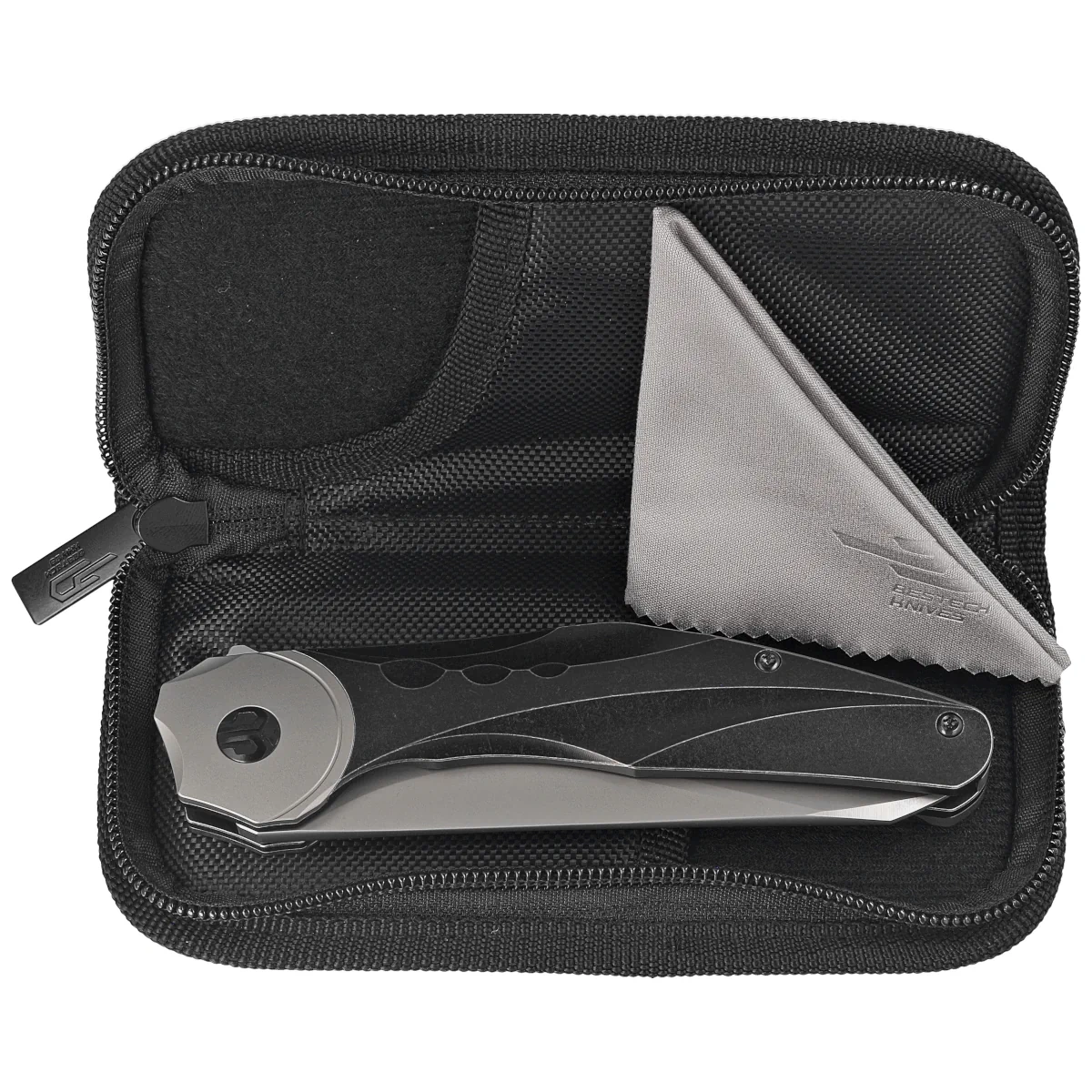 Rękojeść – z frezowanego tytanu 6AL4V, fazowane krawędzie okładek eliminują ostre krawędzie. Całość przykręcona do solidnego backspacera, również wykonanego z tytanu. Oś pivota zdobi bolster z tytanu w kontrastowym kolorze. Podcięcie na palec (fore finger groove) poprawia pewność uchwytu. Jednopozycyjny (prawa) tytanowy klips deep carry pozwala przenosić dyskretnie nóż w kieszeni w pozycji tip-up (czubkiem ostrza do góry).