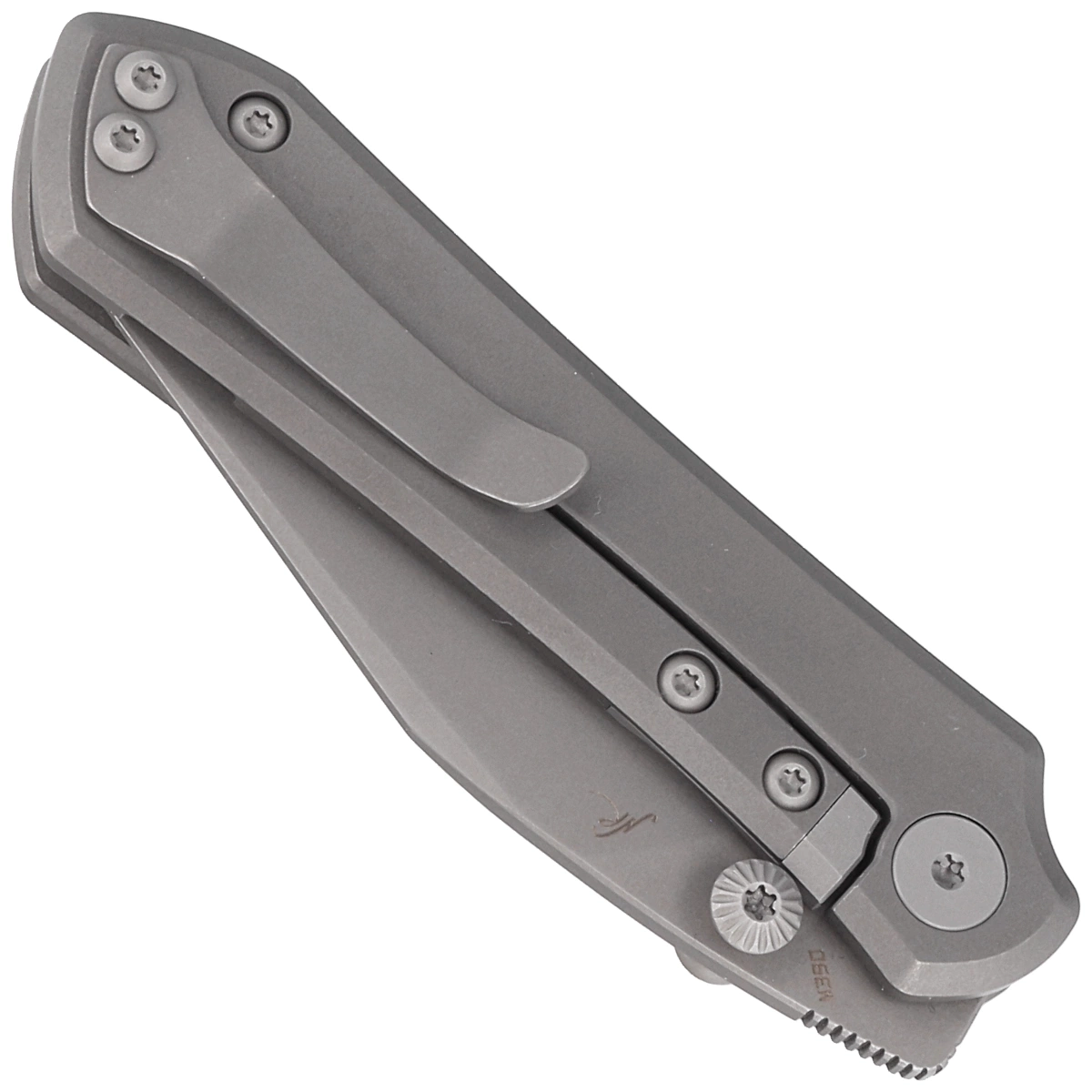 Rękojeść – to dwa kawałki litego tytanu 6AL4V wykończone metodą Dark Stonewashed. Ergonomicznie profilowane, eliminują ostre ranty dla wygody, nacięcia wykonane w okładzinie poprawiają pewność uchwytu. Otwarta konstrukcja tzw. open-backed bez typowego backspacera, mocowana do siebie stalowymi tulejami dystansowymi ułatwia czyszczenie. Jednopozycyjny, prawostronny tytanowy klips umożliwia przenoszenie noża w pozycji tip-up, czubkiem ostrza ku górze.
