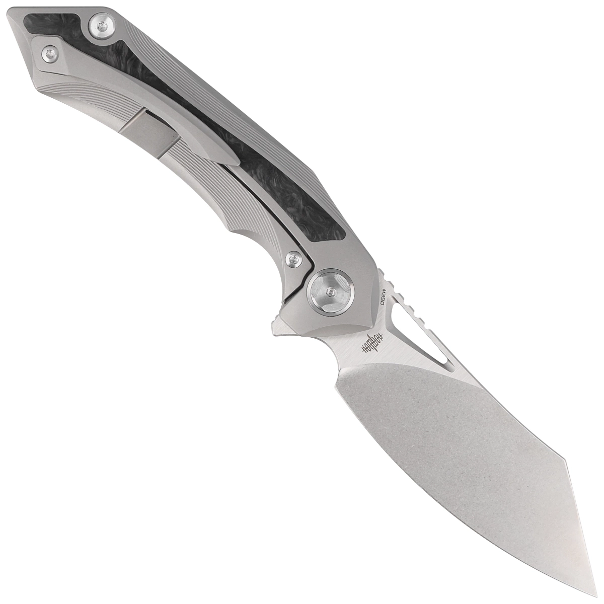 Rękojeść – to dwa kawałki litego tytanu 6AL4V z efektownymi marmurkowymi wstawkami z Marble Carbon Fiber. Schodkowo fazowane krawędzie okładek eliminują ostre ranty dla wygody i poprawiają pewność uchwytu. Masywny tytanowy backspacer do którego przymocowano okładziny gwarantuje sztywność i wytrzymałość całej konstrukcji. Jednopozycyjny, prawostronny tytanowy klips umożliwia przenoszenie noża w pozycji tip-up, czubkiem ostrza ku górze.
