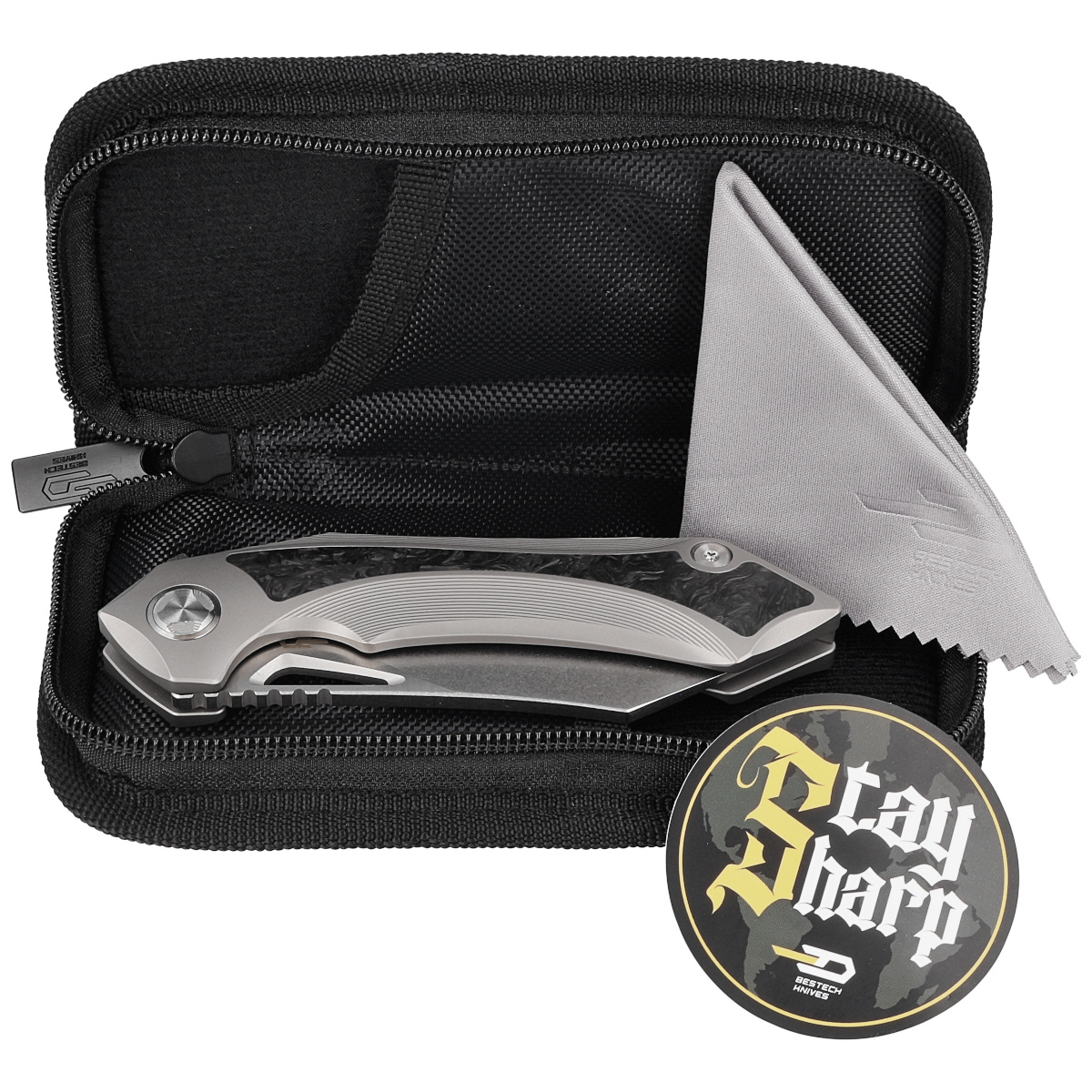 Futerał – nóż zapakowano w zapinany zamkiem nylonowy miękki pouch z logo marki służący do bezpiecznego przenoszenia i przechowywania foldera.
