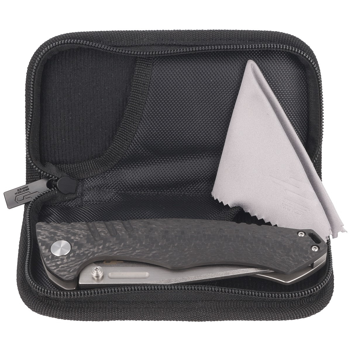 Futerał – nóż zapakowano w zapinany zamkiem nylonowy miękki pouch z logo marki służący do bezpiecznego przenoszenia i przechowywania foldera.