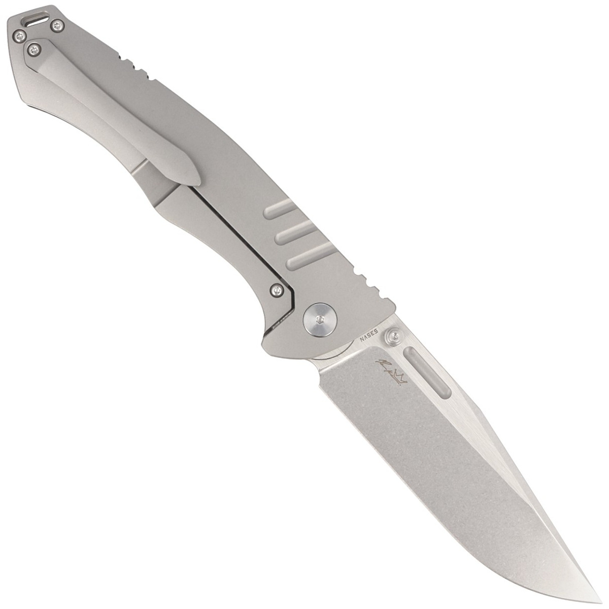 Rękojeść – strona reprezentacyjna wykonana z Carbon Fiber, strona blokady z litego tytanu 6AL4V. Fazowane krawędzie okładek eliminują ostre ranty dla wygody i poprawiają pewność uchwytu. Masywny tytanowy backspacer do którego przymocowano okładziny gwarantuje sztywność i wytrzymałość całej konstrukcji. Fragment grzbietu rękojeści pokryto upper jimping, karbowanym oparciem pod kciuk ułatwiającym kontrolę nad nożem. Jednopozycyjny, prawostronny tytanowy klips umożliwia przenoszenie noża w pozycji tip-up, czubkiem ostrza ku górze.