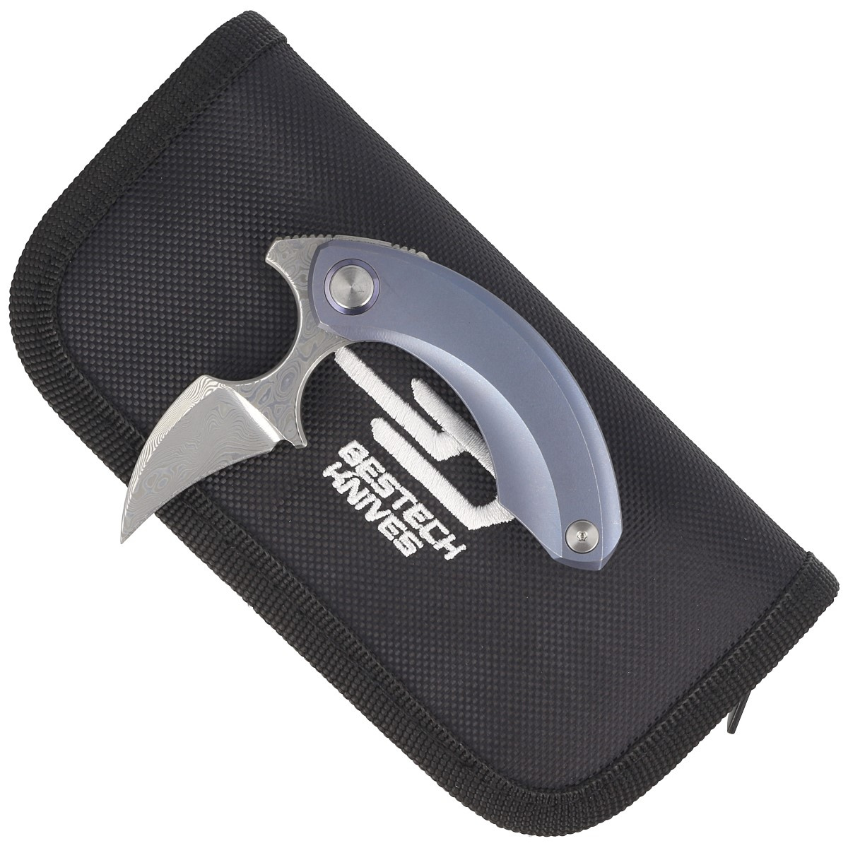 Strelit Blue Titanium, Damascus niezwykły folder push dagger dla wymagających odbiorców, efekt współpracy polskiego projektanta Ostapa Hela i firmy Bestech Knives. Ergonomiczna rękojeść, niezwykła stal ostrza!!!