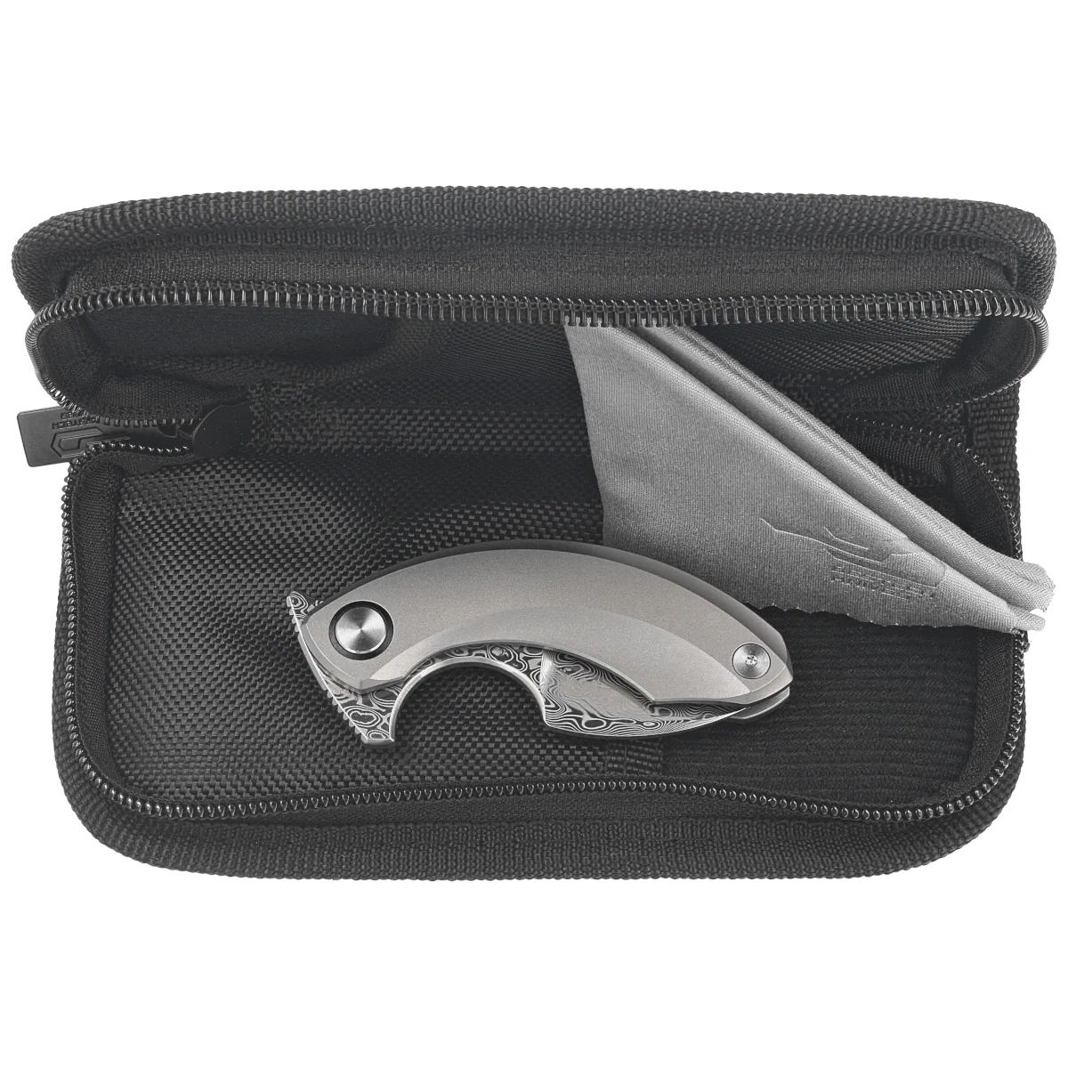 Futerał – nóż zapakowano w zapinany zamkiem nylonowy miękki pouch z logo marki służący do bezpiecznego przenoszenia i przechowywania foldera.