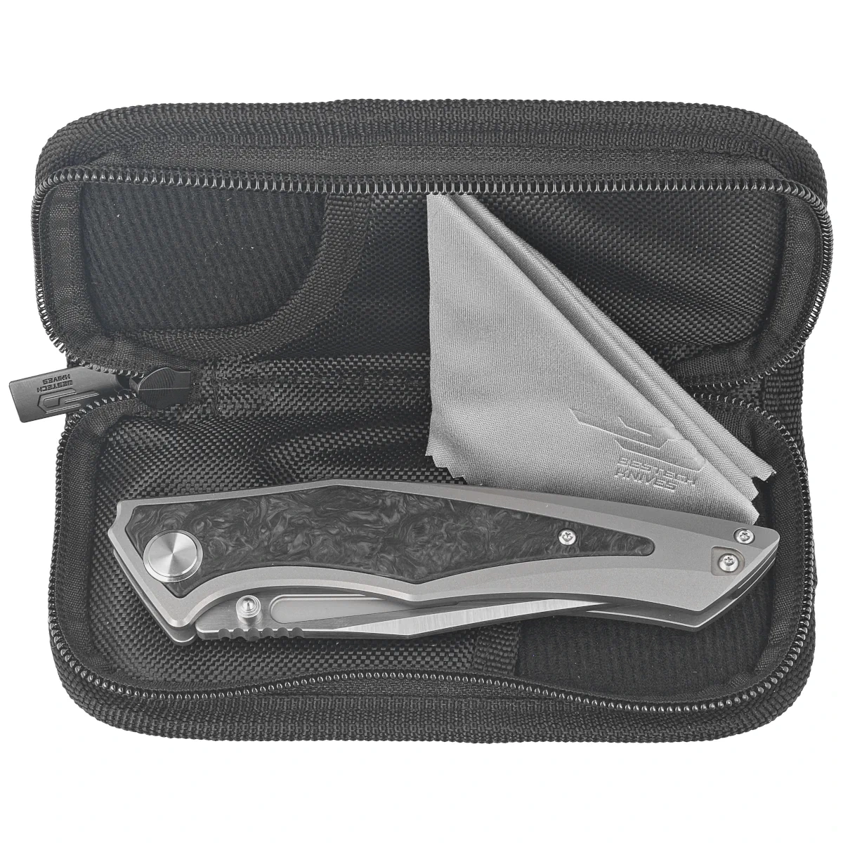 Futerał – nóż zapakowano w zapinany zamkiem nylonowy miękki pouch z logo marki służący do bezpiecznego przenoszenia i przechowywania foldera.