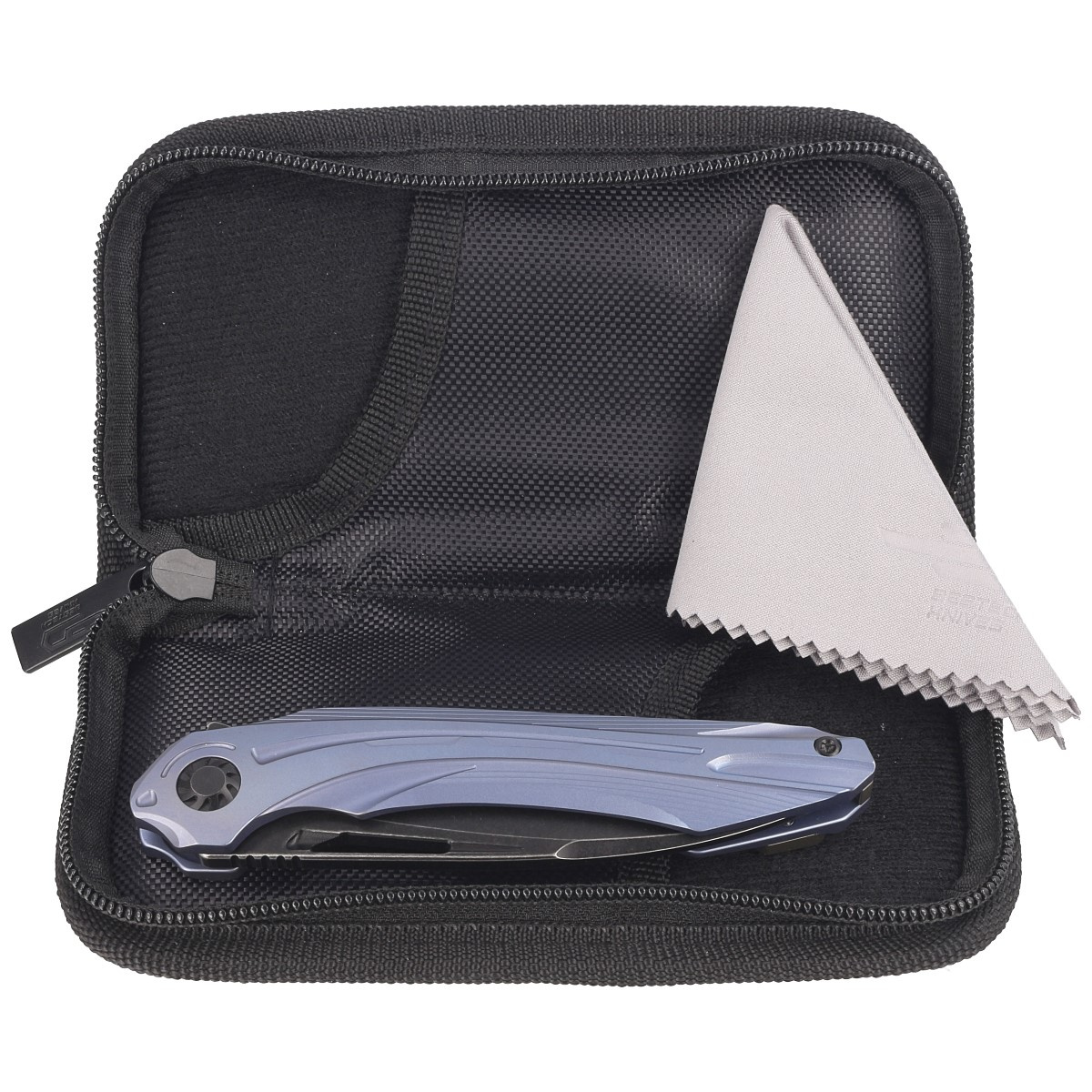 Futerał – nóż zapakowano w zapinany zamkiem nylonowy miękki pouch z logo marki służący do bezpiecznego przenoszenia i przechowywania foldera.