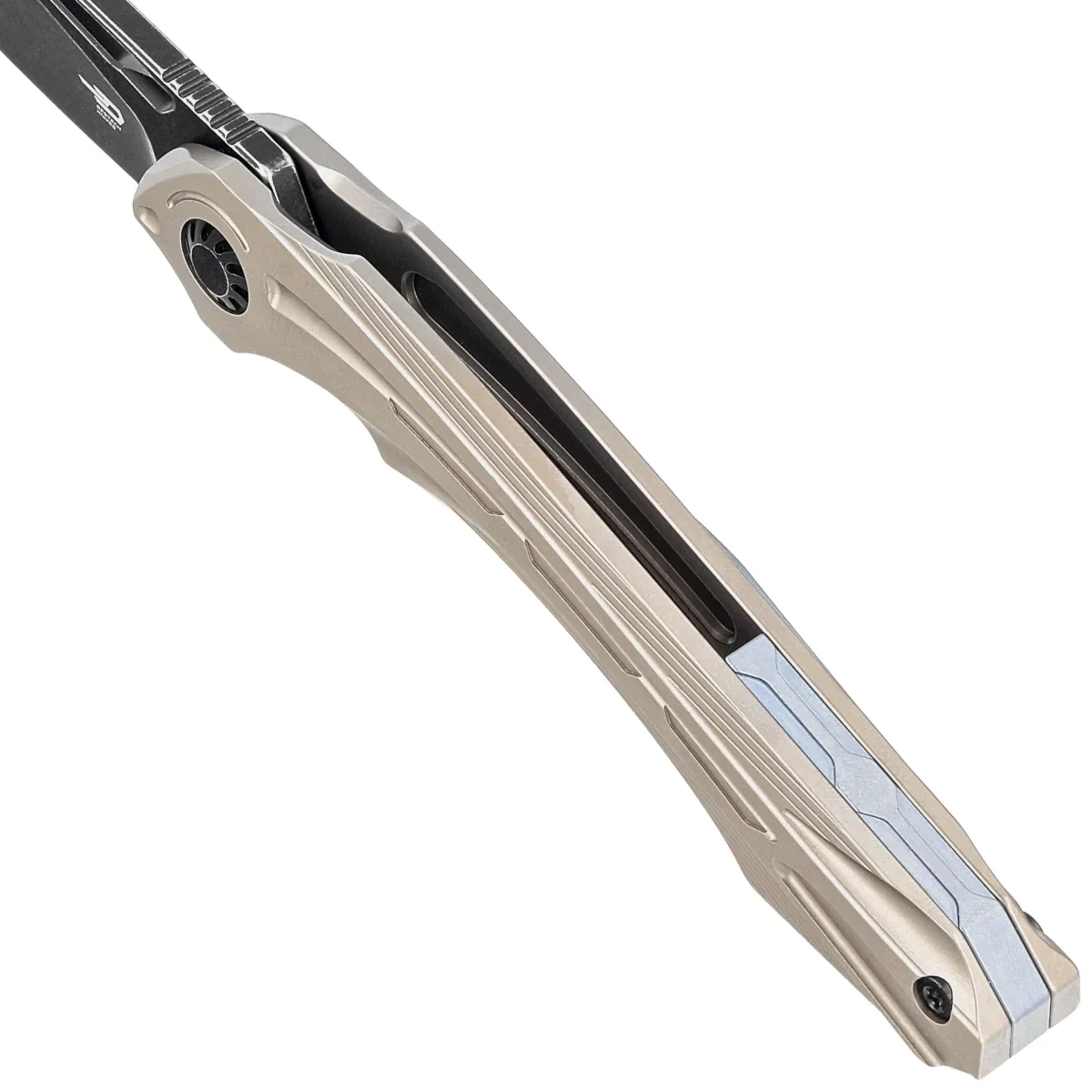 Rękojeść – to dwa kawałki litego tytanu 6AL4V z efektownymi zdobieniami wykonanymi obrabiarkami cyfrowymi CNC. Fazowane krawędzie okładek eliminują ostre ranty dla wygody i poprawiają pewność uchwytu. Masywny tytanowy backspacer do którego przymocowano okładziny gwarantuje sztywność i wytrzymałość całej konstrukcji. Jednopozycyjny, prawostronny tytanowy klips umożliwia przenoszenie noża w pozycji tip-up, czubkiem ostrza ku górze.