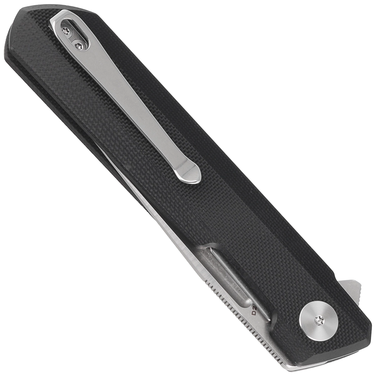 Rękojeść – wykonana z G10, kompozytowego materiału z włókna szklanego prasowanego pod ciśnieniem z syntetyczną żywicą. Agresywna tekstura okładzina zapewnia pewny chwyt, nawet mokrymi dłońmi. Fazowane krawędzie okładek eliminują ostre krawędzie dla wygody, a wykonany z przodu podcięcie na palec poprawia ergonomię. Otwarta konstrukcja tzw. open-backed mocowana stalowymi tulejami dystansowymi redukuję wagę oraz ułatwia czyszczenie. Dwupozycyjny, prawo/lewostronny klips deep carry pozwala przenosić dyskretnie nóż w kieszeni w pozycji tip-up (czubkiem ostrza ku górze).