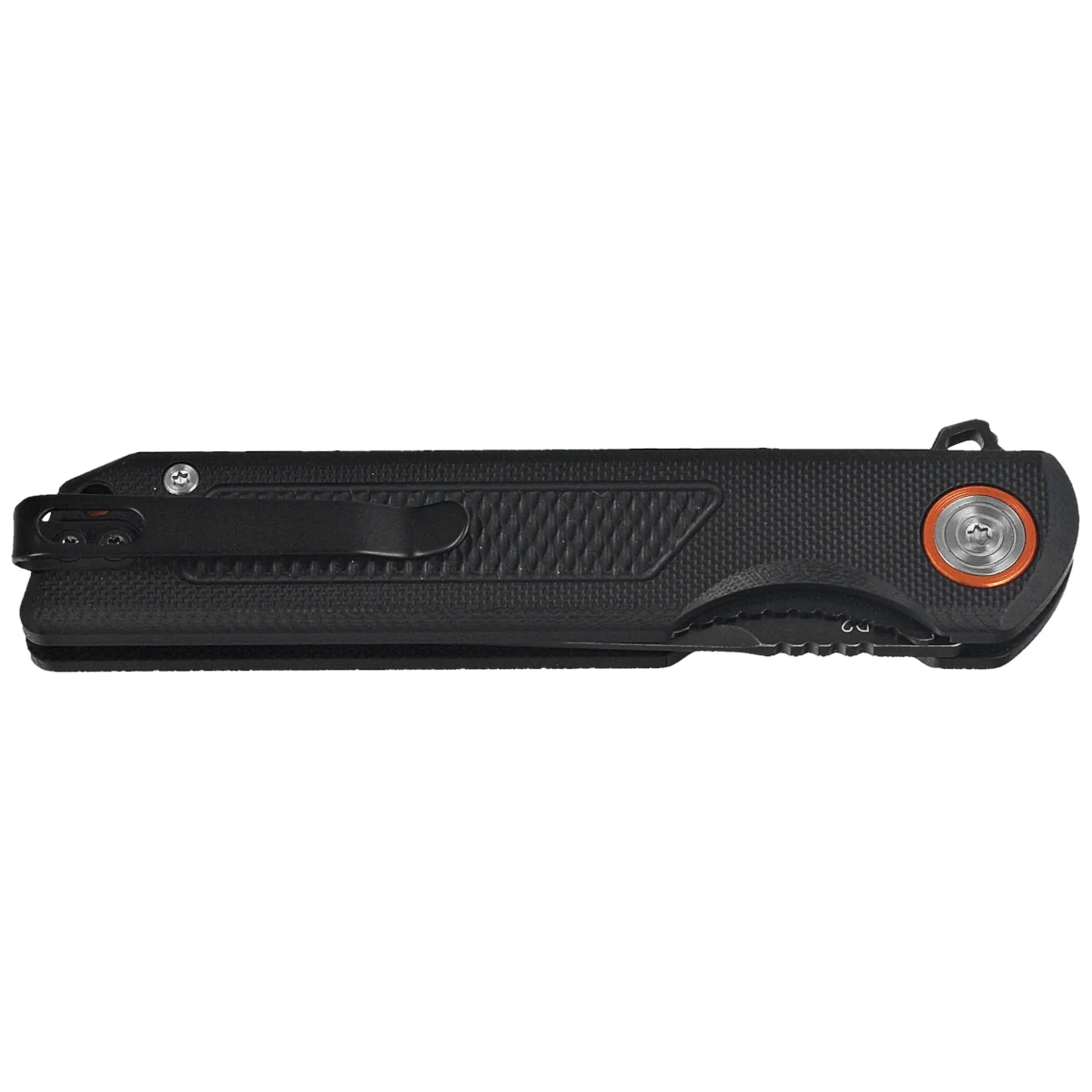 Głownia – typu Tanto, wykończona maskująca rysy kąpielą w w drobnych kamykach Stonewashed, a następnie pokryta czarną powłoką PTFE. Grubość ostrza w połączeniu z wysokim płaskim szlifem (Flat Grind) daje doskonałe właściwości tnące połączone z wysoką wytrzymałością. Otwarcie ostrza za pomocą szybkiej płetwy flippera (index-finger flipper). Po otwarciu płetwa tworzy mini-gardę zapobiegającą ześlizgnięciu się dłoni na ostrze. Aby zachować pełną kontrolę nad ostrzem, na grzbiecie klingi upper jimping, karbowane oparcie pod kciuk. Całość blokowana jest sprawdzoną i popularną blokadą liner lock.