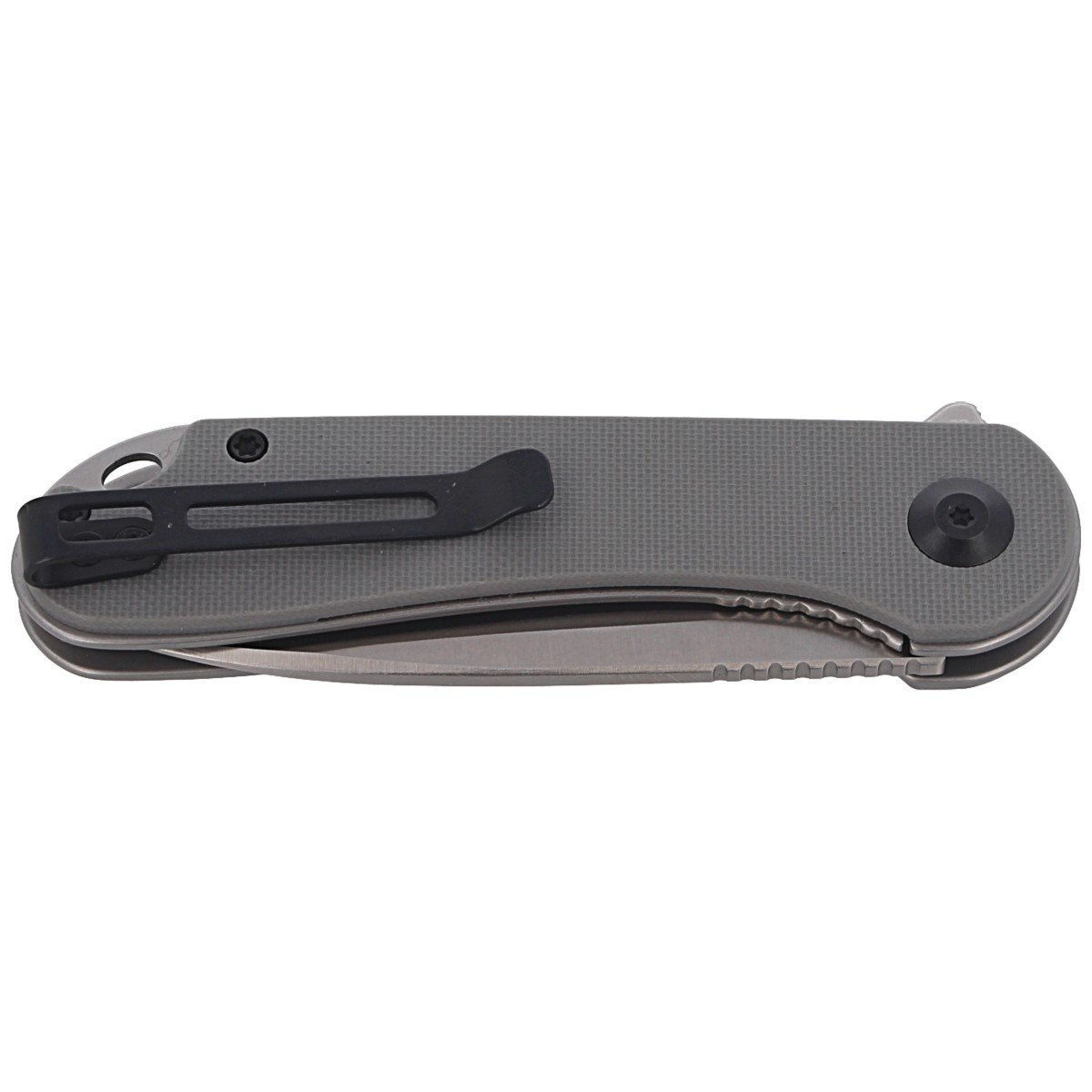 Rękojeść – okładziny w modnym jasnoszarym kolorze z tworzywa G10, teksturowane dla poprawienia pewności uchwytu. Całość mocowana do stalowych linersów. W praktyce oznacza to wiele lat pracy bez osłabienia konstrukcji. Otwarta konstrukcja tzw. open-backed bez typowego backspacera, mocowana do siebie stalowymi tulejami dystansowymi ułatwia czyszczenie w terenie. Oś pivota zdobi stylizowane logo marki Civivi. Prawostronny metalowy klips deep carry pozwala przenosić dyskretnie nóż w kieszeni w pozycji tip-up (ostrzem do góry). Nad klipsem lanyard hole, owalny otwór na linkę.
