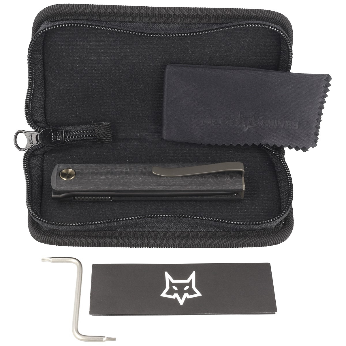 Chnops Black Carbon Fiber, Black PVD to smukły nóż typu gentlemans folder. Piękne okładziny z włókna węglowego, tytanowy klips, backspacer oraz śruby, ostrze z doskonałej stali M390 pokrytej dodatkowo czarną powłoką PVD. Doskonały wybór na EDC! Zaprojektowany dla firmy Fox Cutlery przez Riccardo Gobbato, włoskiego designera i knifemakera.