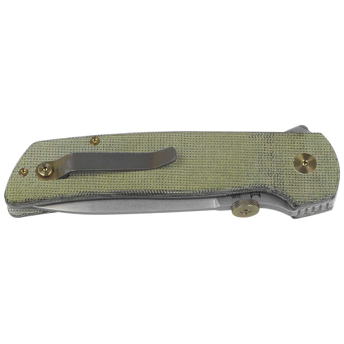 Rękojeść – z wysokowytrzymałego kompozytu Canvas Micarta w odcieniu OD Green, materiału odpornego na działanie wilgoci, zabrudzenia oraz uszkodzenia mechaniczne. Delikatne fazowanie krawędzi i anatomiczne profilowanie uchwytu zapewniają naturalne ułożenie dłoni, zwiększając stabilność i kontrolę operowania nożem przy dłuższej pracy. Struktura materiału zachowuje przyczepność nawet w trudnych warunkach, zapewniając pewny chwyt również w rękawicach lub przy zwiększonej wilgotności.