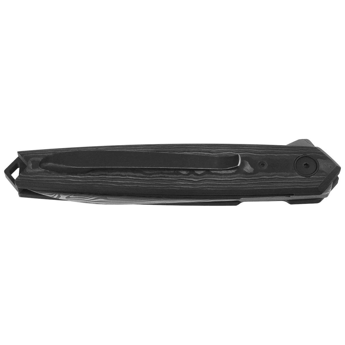 Rękojeść – z kompozytu Black Camo Fat Carbon, zapewnia trwałość i wygodny chwyt nawet przy wilgotnych dłoniach. Subtelne profilowanie poprawia ergonomię, a stalowe linery stabilizują całość konstrukcji. Całość uzupełnia klips typu tip-up, umożliwiający dyskretne przenoszenie noża w kieszeni. Backspacer z Black Camo Fat Carbon nie tylko wzmacnia konstrukcję, ale dodaje także akcent wizualny. Tylne oczko umożliwia montaż linki lub bead’a. Projekt łączy klasyczne linie z nowoczesnymi materiałami, tworząc konstrukcję solidną, estetyczną i przygotowaną na intensywne użytkowanie.