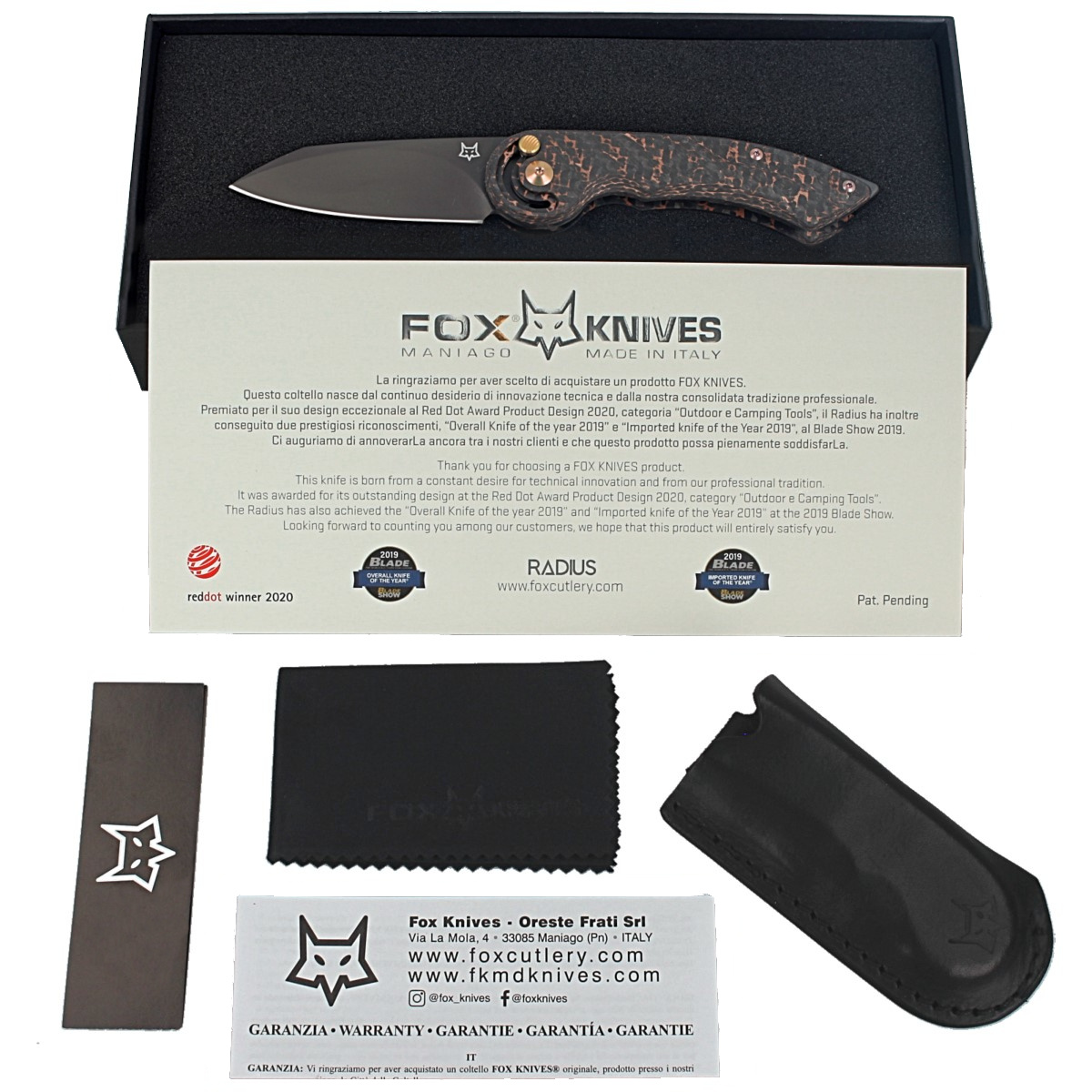 Radius Carbon Fiber/Copper, Black PVD M390 nagrodzony prestiżowymi nagrodami Imported Knife of The Year i Overall Knife of The Year na targach nożowych Blade Show w Atlancie oraz wyróżnieniem Red Dot Award Product Design w kategorii Outdoor and Camping Equipment. Zaprojektowany przez znanego włoskiego knifemakera, Denisa Simonuttiego.