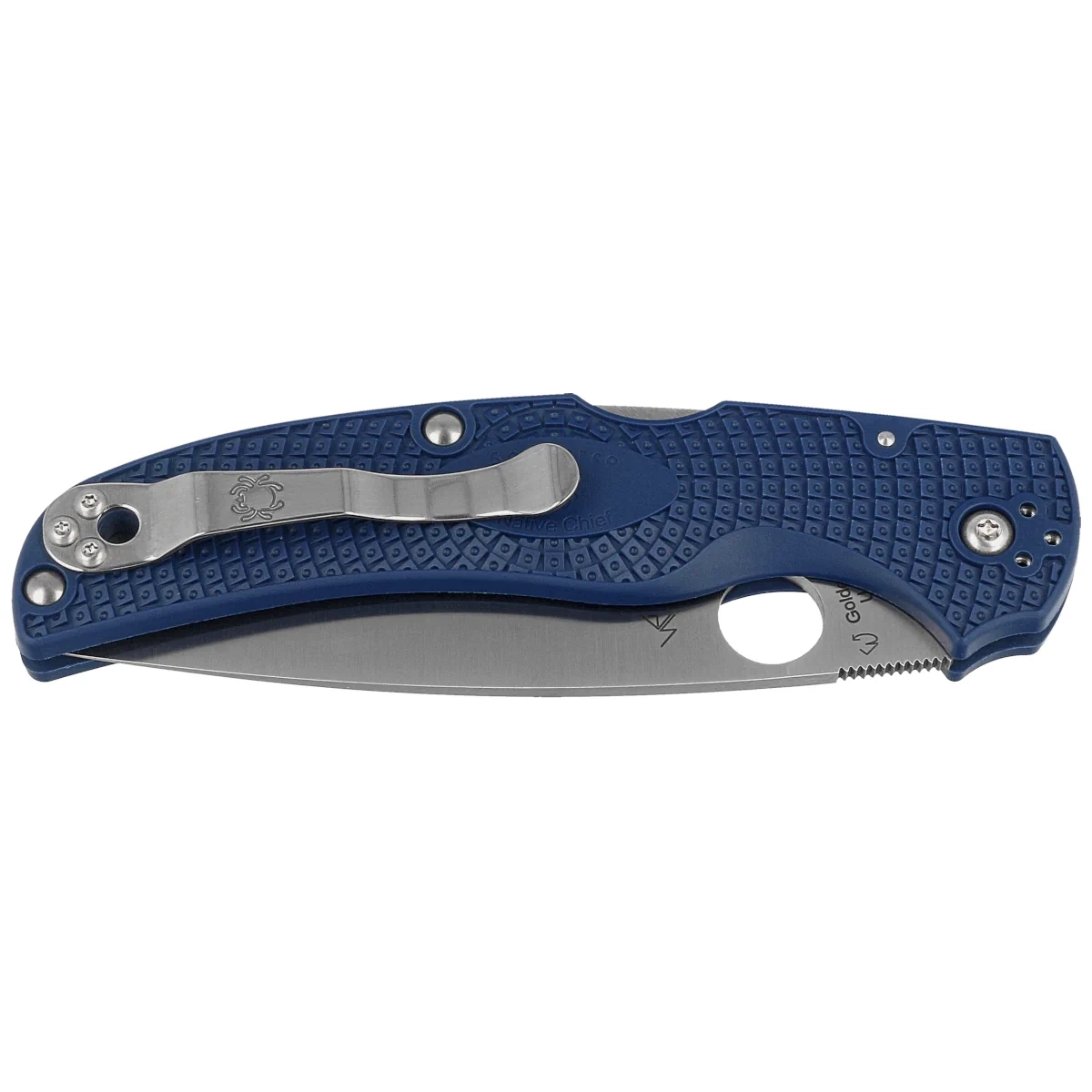 Głownia – ostrze gładkie Plain wyprowadzone szlifem płaskim pełnym (Full Flat Grind). Powiększone 14 mm okrągłe wycięcie SpyderHole (patent Spyderco) do oburęcznego otwierania kciukiem. Dopracowany, precyzyjnie obrobiony mechanizm blokady głowni Back-Lock gwarantuje niezwykłą płynność działania. Karbowane oparcie pod kciuk (upper jimping) na grzbiecie klingi oraz Finger Choil (podcięcie pod palec wskazujący między rękojeścią a krawędzią tnącą) ułatwiają panowanie nad nożem.