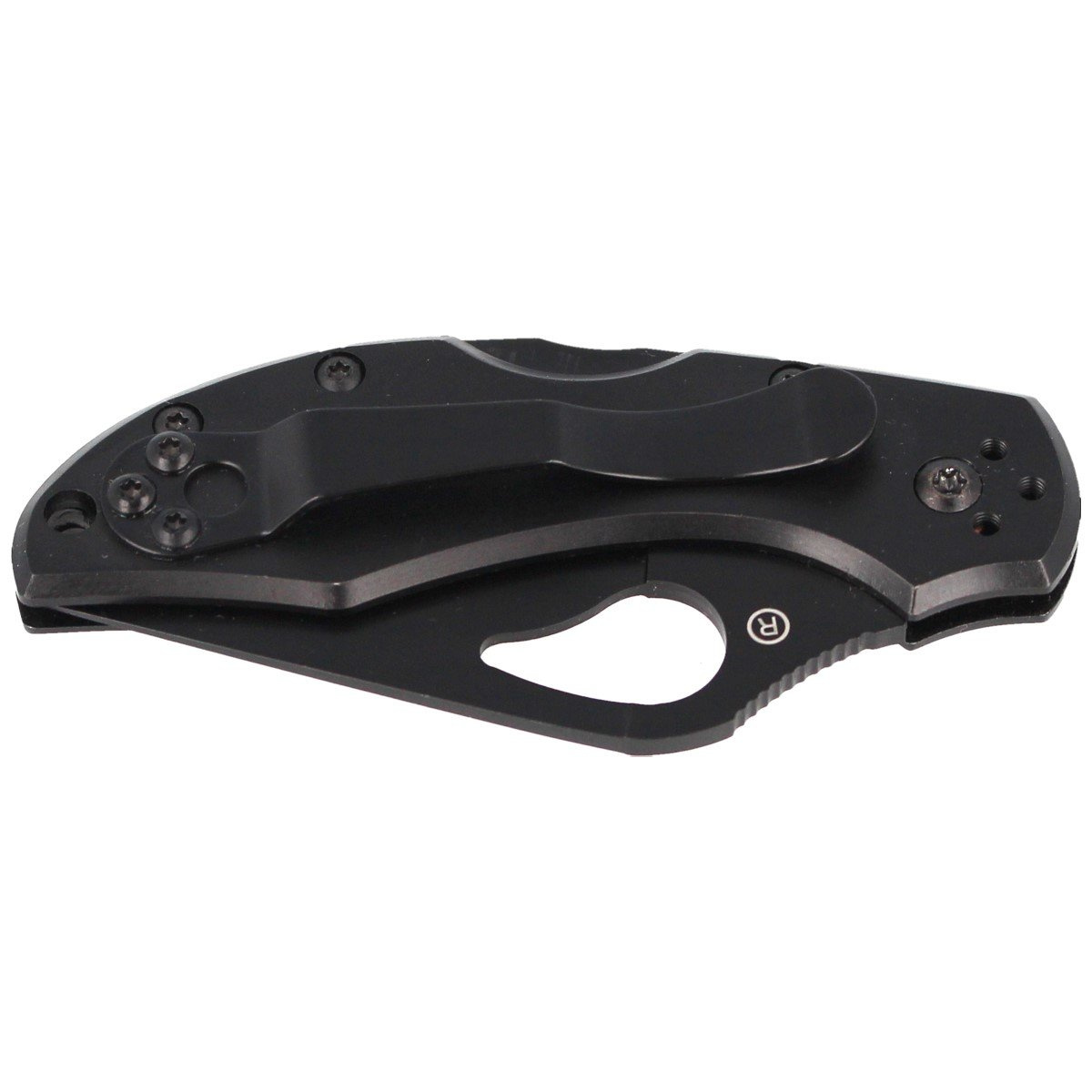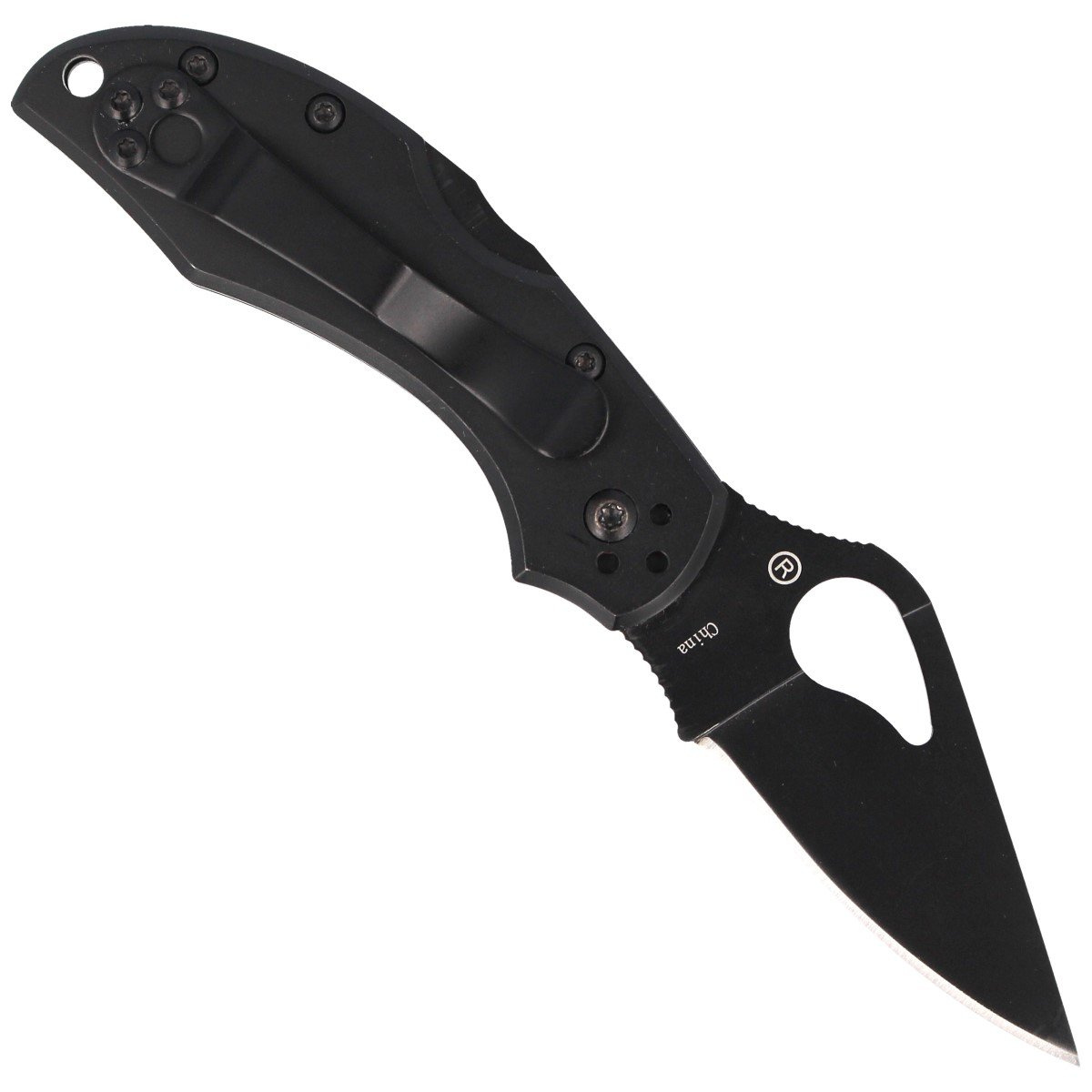 Głownia – o profilu Drop Point pokryta wytrzymałą matową powłoką proszkową black oxide coating. Ostrze gładkie Plain wyprowadzono szlifem pełnym płaskim (Full Flat Grind). Płaski szlif zapewnia doskonałą geometrię krawędzi tnącej oraz redukuje wagę noża. Karbowany grzbiet głowni, rampa (spine jimping / crosshatching) ustawia kciuk dając solidne podparcie, a łukowate podcięcie pod palec między rękojeścią a krawędzią tnącą (finger choil jimping) ułatwia kontrolę nad folderem. Wycięcie w kształcie komety Comet-shaped (patent Spyderco) do szybkiego otwarcie klingi. Blokada głowni Back-Lock z wycięciem w kształcie półksiężyca projektu Davida Boye’a zabezpiecza przed złożeniem ostrza podczas intensywnego użytkowania.