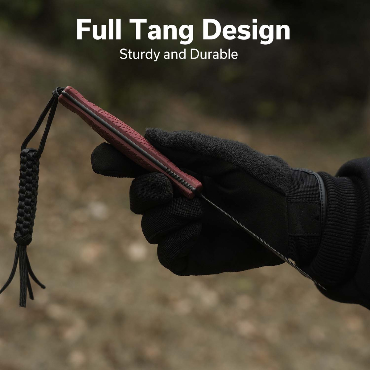 Głownia – smukła, typu Dagger, pokryta powłoką o wzorze Black/Gray Striped. Ostrze gładkie Plain, jednostronnie ostrzona (Single Edge), płaski szlif (Flat Grind) daje doskonałą geometrię krawędzi tnącej oraz ekstremalną wydajność cięcia. Rozszerzenie przy rękojeści tworzy gardę zabezpieczającą przed zsunięciem się dłoni na ostrze. Choil ułatwia ostrzenie.
