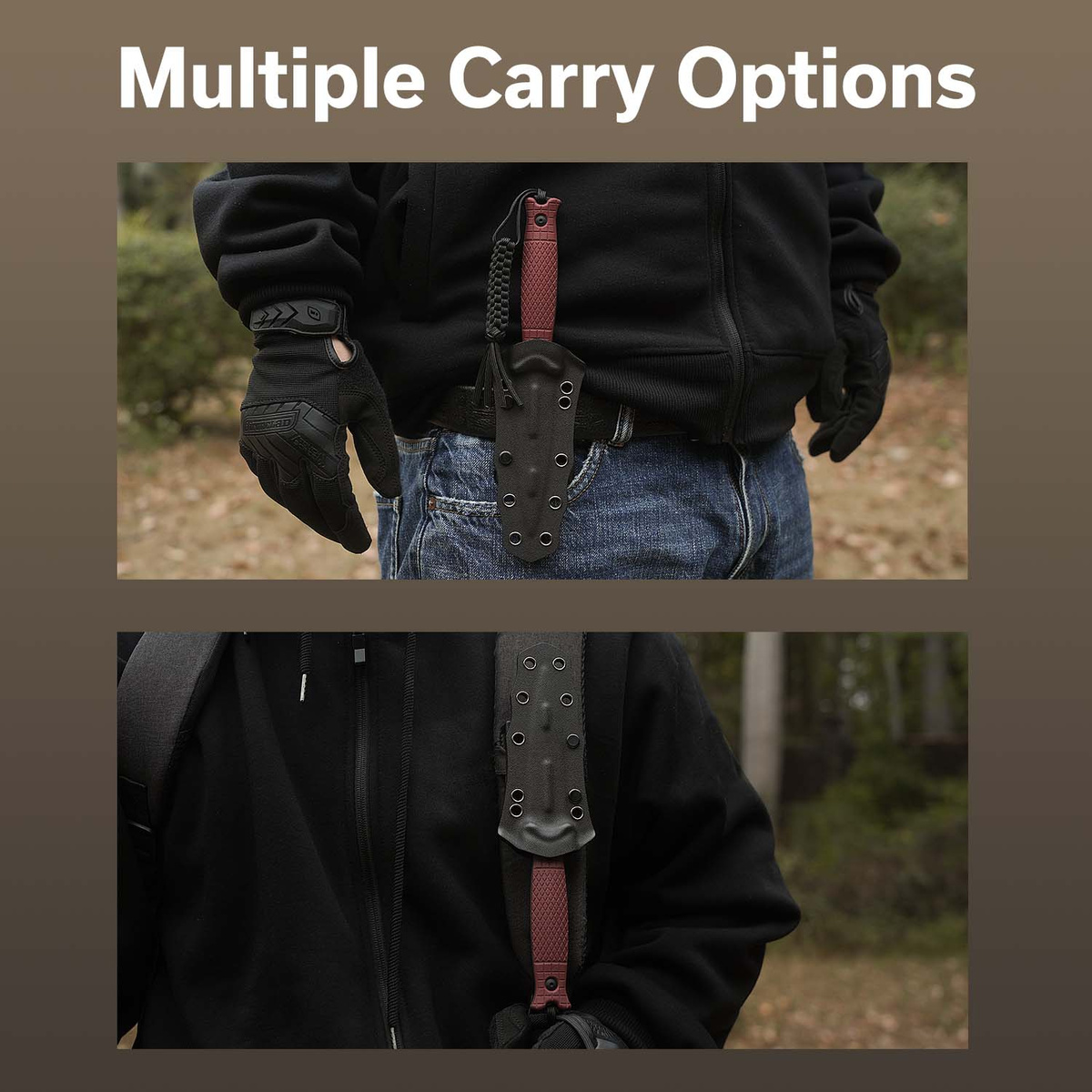 Pochwa – wykonana z czarnego kydexu bezpiecznie utrzymująca nóż na miejscu. Wyposażona w mocowanie T-Clip zaprojektowane przez Boba Terzuolę, umożliwia wielopozycyjne (prawe/lewe, pionowe/poziome) przenoszenie pochwy z stałym ostrzem na pasie lub oporządzeniu. T-Clip działający podobnie jak Tek-Lok pozwala na dopasowanie sposobu noszenia do indywidualnych preferencji użytkownika. Wzmocniony włóknem szklanym T-Clip, zawiera zestaw śrub wraz z parą plastikowych podkładek.