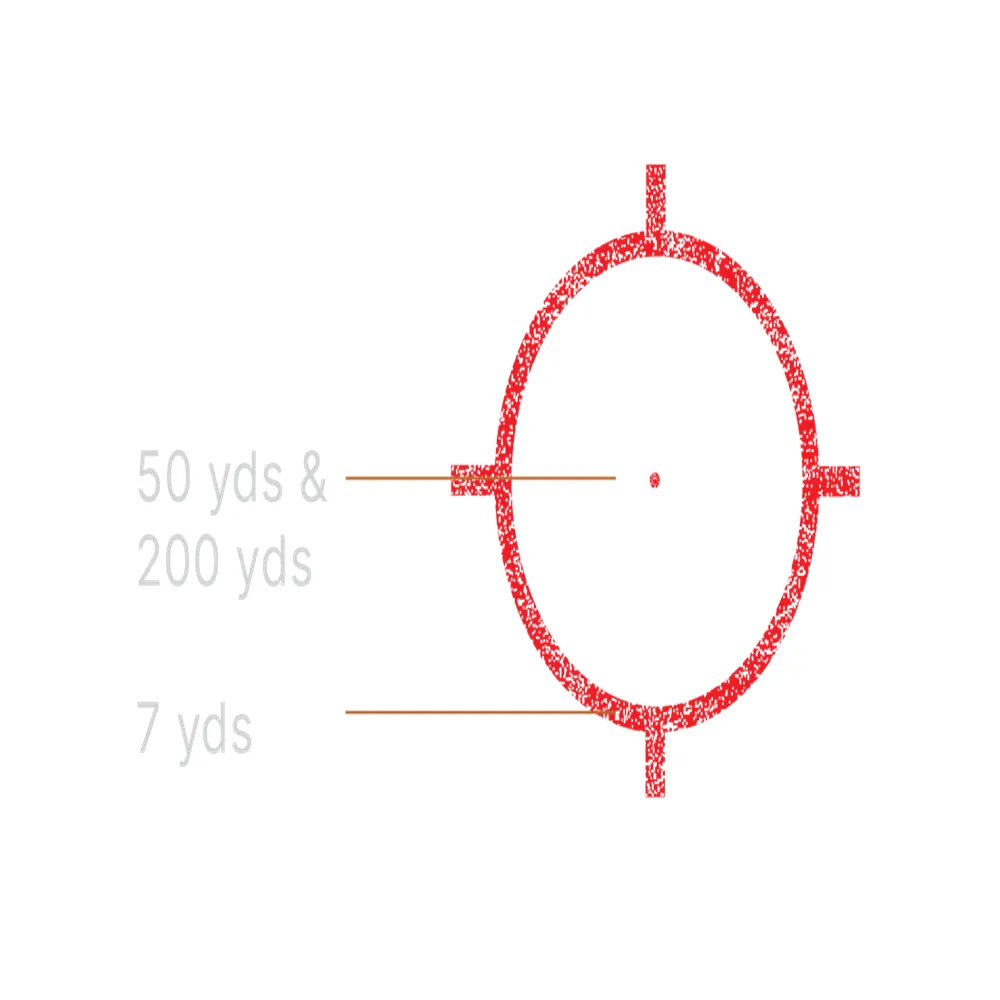 Centralny punkt 1 MOA przy ustawienie na odległość ok 50 m będzie również pokrywał się z punktem trafienia na 200m, dolna krawędź koła celowniczego natomiast będzie oznaczać punkt trafienia na odległości ok 6,5 m.