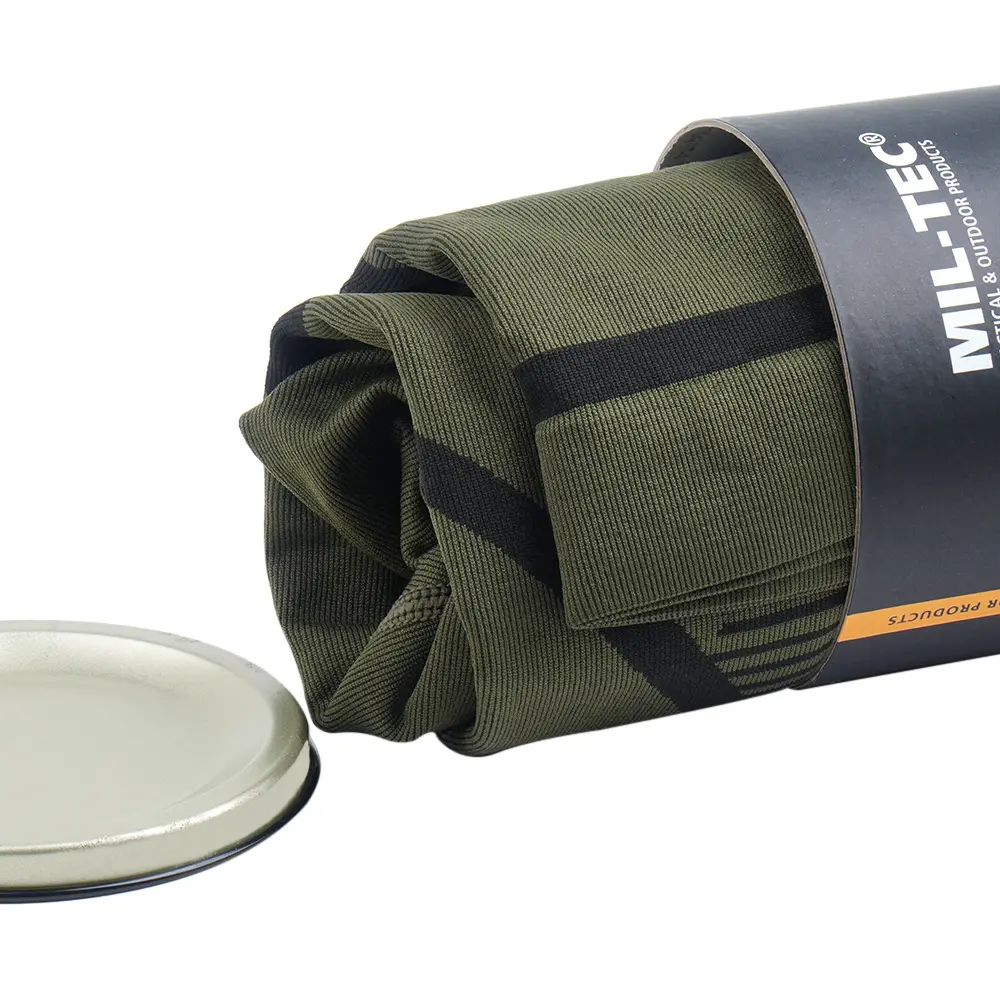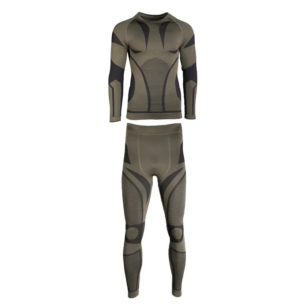 Komplet bielizny termoaktywnej Performance w kolorze oliwkowym z czarnymi nadrukami podkreślającymi sylwetkę. Polecana na pierwszą warstwę odzieży w trakcie każdej aktywności outdoorowej takiej jak trekking czy marsze patrolowe. Sprawdzi się również w roli odzieży sportowej do biegania, jazdy na rowerze i wszędzie tam, gdzie wymaga się wzmożonej aktywności fizycznej.