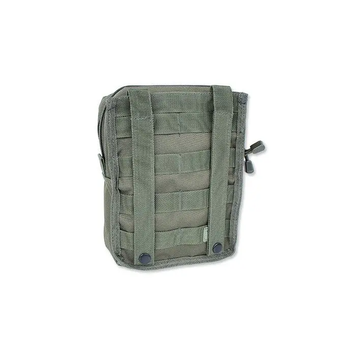 Na frontowej, zewnętrznej ścianie producent umieścił taśmy montażowe zgodne ze standardem MOLLE/PALS pozwalające na zamocowanie dodatkowych pokrowców. Do pasa, kamizelki lub plecaka całość mocowana jest za pomocą dwóch pionowych troków.