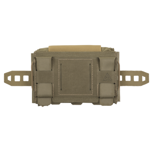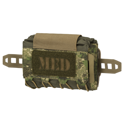 Wykonana z Cordury® 500D, nylonu 210D oraz laserowo ciętego laminatu apteczka zaprojektowana do przenoszenia na tylnej części pasa. Świetnie współpracuje z HORNET® Skeletonized Belt Sleeve, choć może być zamontowana na dowolnej platformie kompatybilnej z MOLLE/PALS czy pasie o szerokości do 45 mm, za pomocą szlufek z paracordu. Pomieści większość najpopularniejszych medykamentów potrzebnych podczas misji, które podczas przenoszenia zabezpieczone będą elastycznymi pętlami. Minimalistyczny insert z uchwytem z Hypalonu® może być obsłużony za pomocą jednej ręki. Na szczycie kieszeni znajduje się szeroka pętla do przenoszenia stazy, natomiast na tylnej części insertu można za pomocą velcro doczepić kieszeń na nożyczki. Napis “MED” ułatwia szybką identyfikację kieszeni.